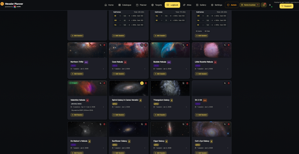 At its heart, the Messier Planner is a digital observing logbook and session planner. But that description doesn’t really do it justice anymore. Sure, it started with the Messier catalogue — because let’s be honest, Messier objects are where most of us cut our teeth. But it quickly grew beyond that. Today, Messier Planner includes: