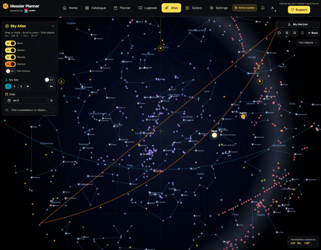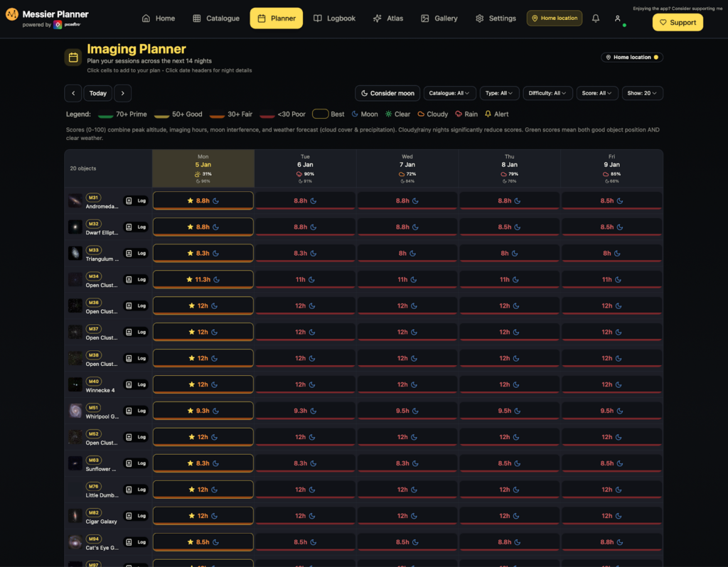 The Messier Planner was designed out of that frustration. I didn’t want another bloated astronomy tool. I definitely didn’t want something that felt like it had been built by people who’d never stood outside at 2am wondering whether clouds were about to roll in. So I designed the Messier Planner tool as a free, forever-useable web-based astro-planning and digital log tool — something that helps you spend the right amount of time planning and to give you more time under the stars.