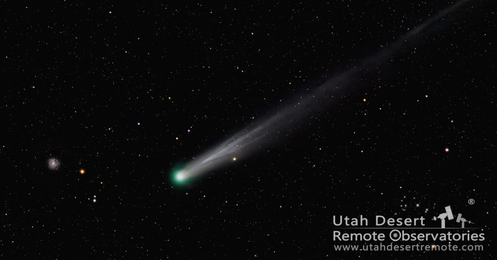 It seems that once a year, the universe provides astrophotographers with a comet to image, and this year is no exception. Last year, comet C/2023 A3 (Tsuchinshan-ATLAS) passed within 44 million miles of Earth on October 12. It was the major comet event of the year and produced countless eye-catching images of the comet’s green core and billowing gray tail. Many of us at UDRO imaged this target, and some of our images were shared in a previous blog.