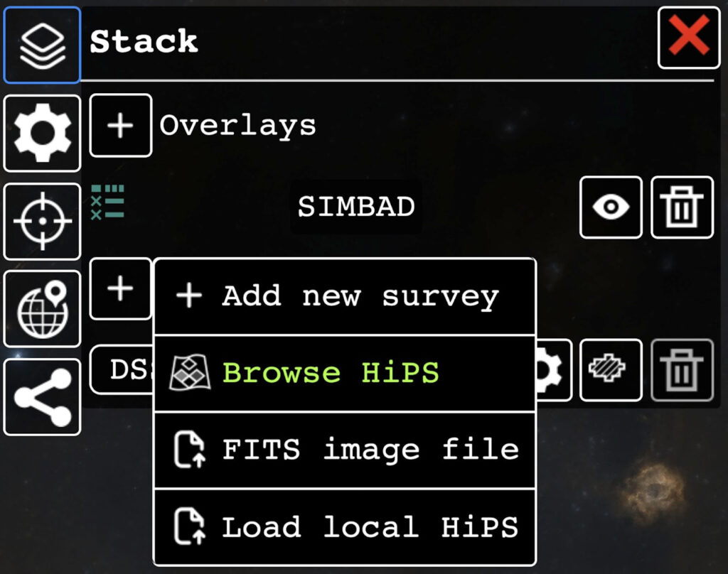 Aladin is a sky atlas tool that goes far beyond other options. Its merit is more on the astronomy research side than the amateur astrophotographer side, but some of its unique features are applicable to astrophotography projects. Aladin comes in two versions: the lite web-based version, and the desktop full-featured version. While what we aim to accomplish is possible within the full version of Aladin, using the web version in combination with Stellarium simplifies the process significantly.