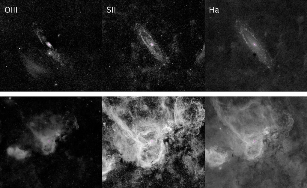 For most applications, if you don’t want to adjust the stretch, the 8-bit versions of the surveys will suffice. The Ha survey is named NSNS DR0.2 H-alpha (8 bit), the SII, NSNS DR0.2 [SII] (8 bit), and the OIII, NSNS DR0.2 [OIII] (8 bit). Clicking the little information symbol next to the survey will open it in a new tab, or it can be added as another layer in the standard Aladin Lite window. The Ha, as you would expect, is the cleanest of these surveys, but the others have great utility in understanding if a given region is strong in different channels. The following figure shows M31 and the Heart nebula in each of the 3 NSNS 8-bit surveys. Notice that even the amateur-discovered oxygen arc shows up in the OIII Andromeda image. These surveys are deep!