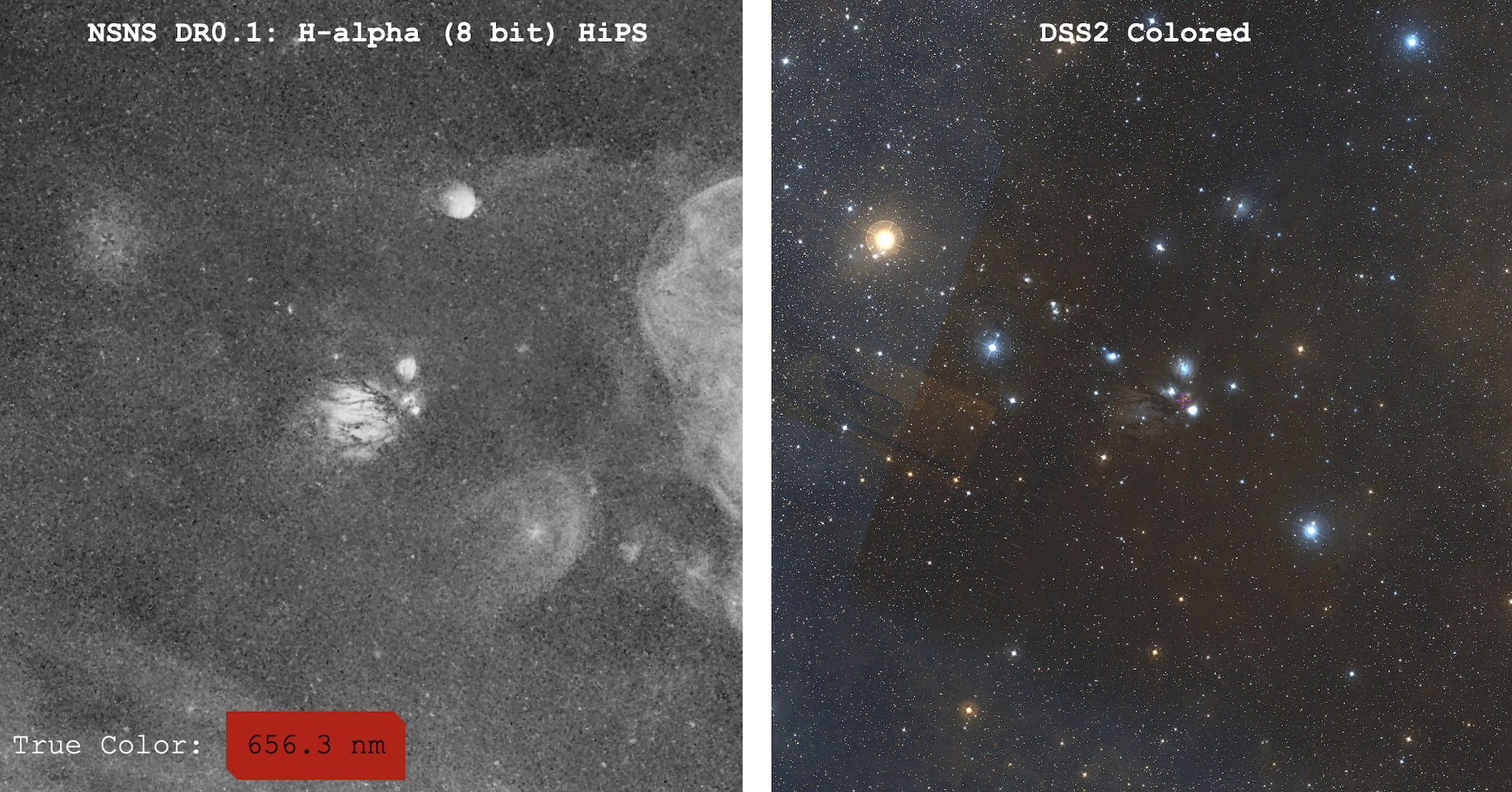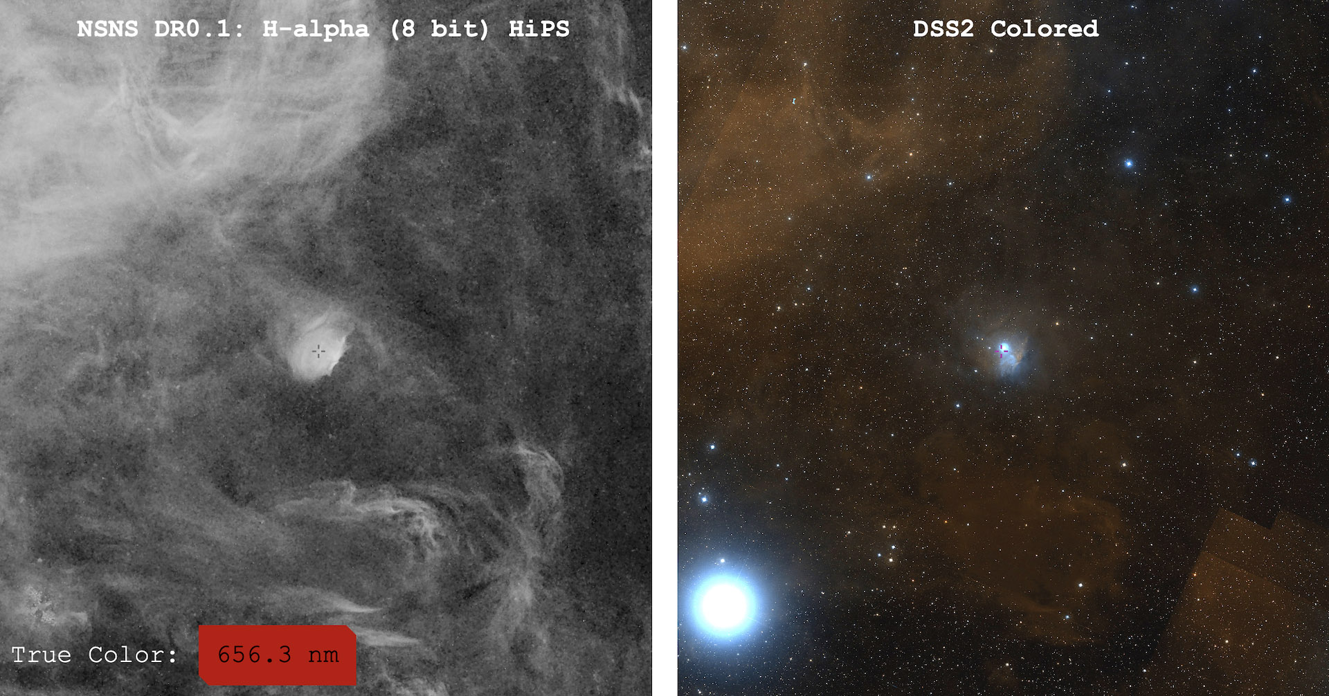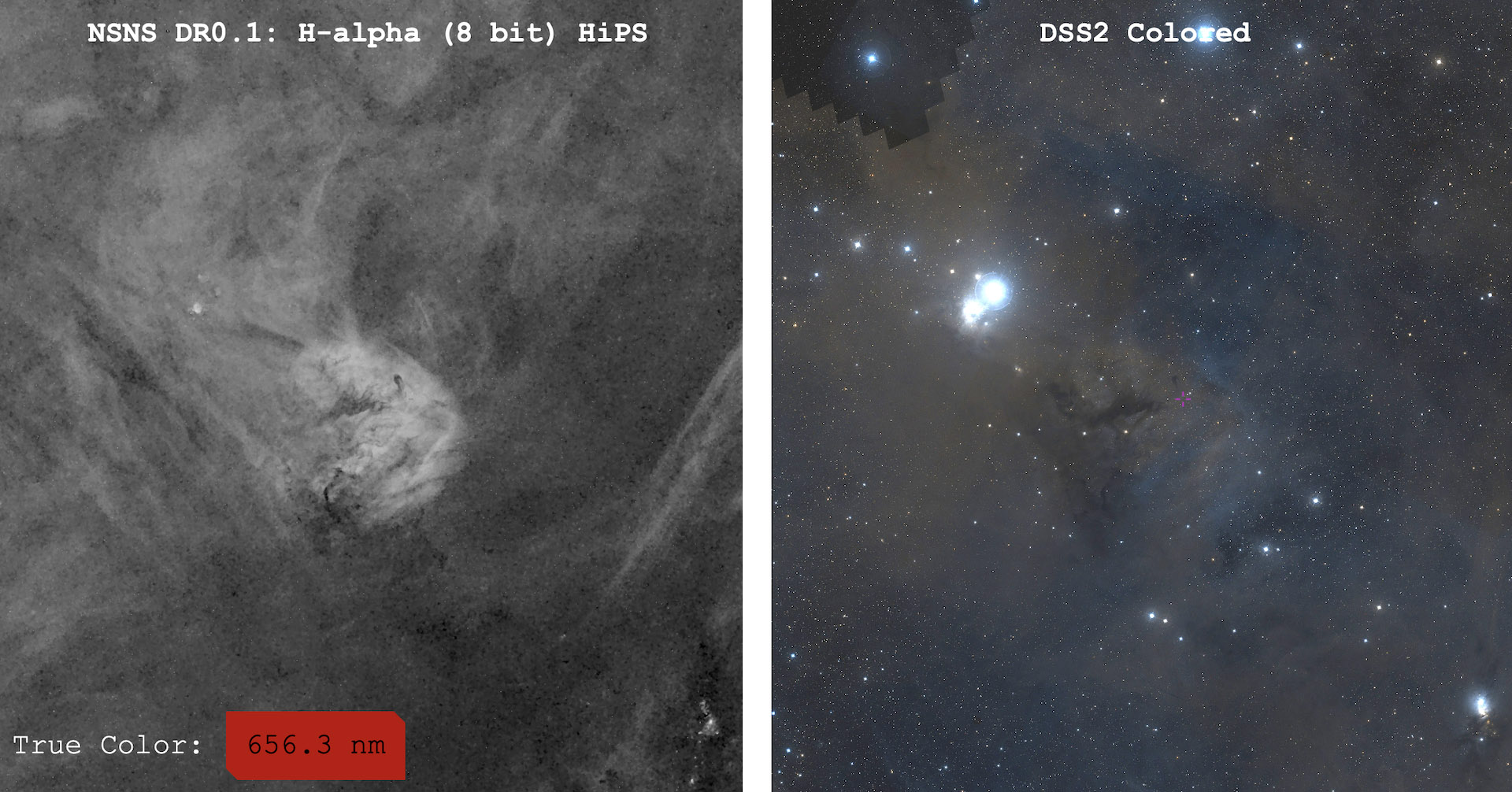 For those with a narrow field of view, the target will dominate the frame, revealing the region’s incredibly fine detail. With a wide field of view, the target will appear suspended in a sea of Ha emission. While it admittedly requires a considerable amount of integration time to resolve well, the background near Thor’s Helmet is composed mostly of ionized hydrogen. The structure of the nebula, in combination with the surrounding background, can be seen in the figure below, which uses images from the NSNS Sky Survey.
